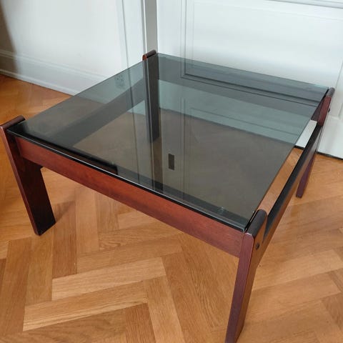 Dette lille, firkantede sofabord med mørk-tonet glasplade er top-smart i den rette sammenhæng.