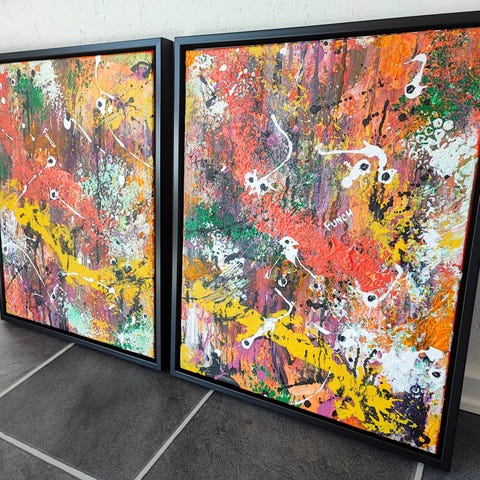 2 stks. fantastisk flotte abstrakte akrylmalerier på lærred med antik-sølvfarvede rammer. H 84cm x B 64cm med ramme. Værket sælges kun samlet, og prisen er for begge. Kunstner: Funch. Afhentes i Lihme-Spøttrup. Fast pris!