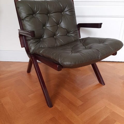 2 superfine klap-lænestole i grønt skind og medhørende bord med tonet glasplade. Selve glasset er meget tykt og solidt (ca. 1 cm).