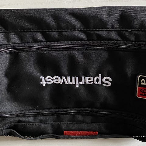 Rød taske med flere indvendige rum og holder. Den kan hænge op så den er nem at tilgå.