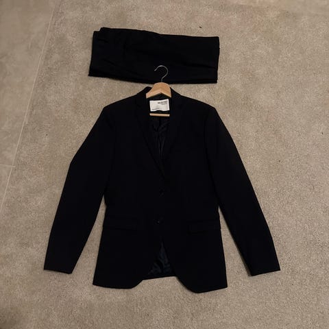 Andet, Jakkesæt Selected Home , Blazer str. 44 Og bukser str. 46, Mørkeblå, Polyester, Woolf, viskose elastane, Næsten som ny, Konfirmations jakkesæt kun brugt en gang er ny renset