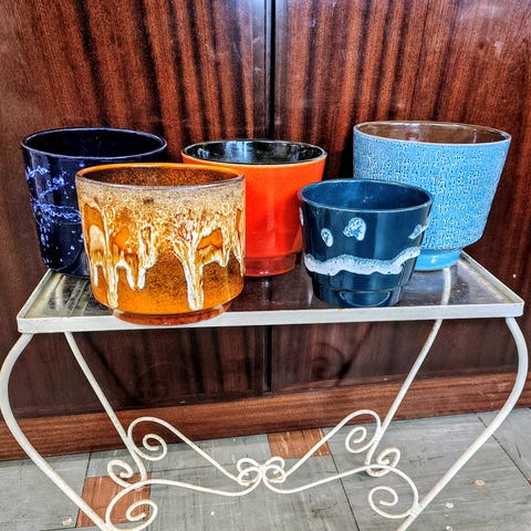Fedeste retro urtepotte fra Knabstrup med lækker lavaglasur i orange, brunlig og lilla.