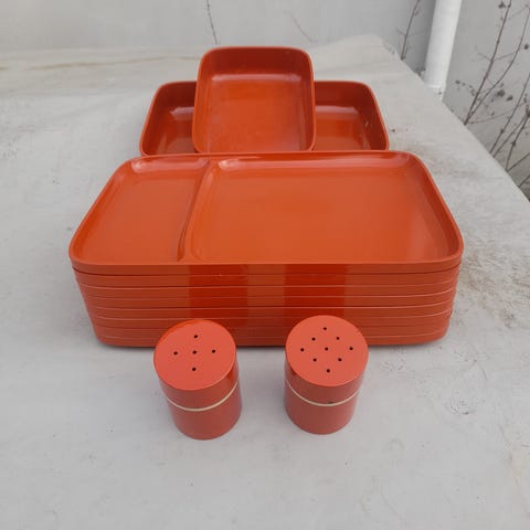 Rosti diverse køkkenartikler sæt i retro farvet plast. indeholder en række forskellige skåle, kopper, tallerkener og redskaber i forskellige størrelser og farver. Ideelt til både daglig brug og udendørs aktiviteter camping Fremstillet af holdbar plast, der er nem at rengøre. Pris fra 30