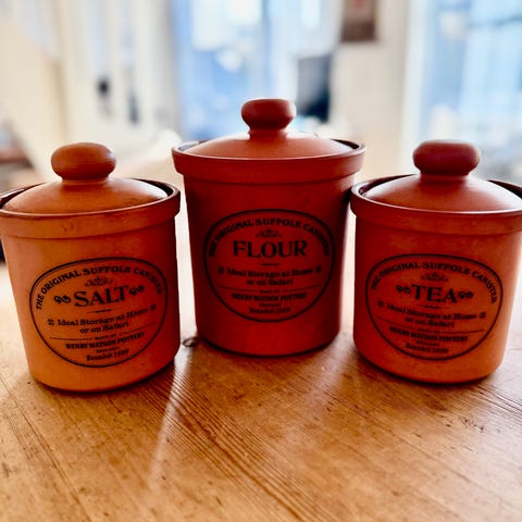 Originale Suffolk Terracotta-Henry Watson Keramik. Mat udvendigt og glaseret indvendigt. Det fleste er ubrugte. Derfor trænger nogle af gummi evt udskiftning. Der er afslag/skår i vanilje og salt, se billeder.
