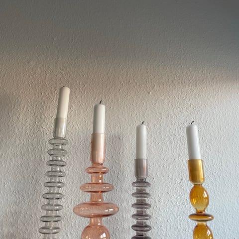 To små fine lysestager fra Studio Sidsel Space og en lille musling skål. Evt til smykker. Alt købt på Trapholt til er af deres markeder. Søljers samlet. Fra ikke ryger.