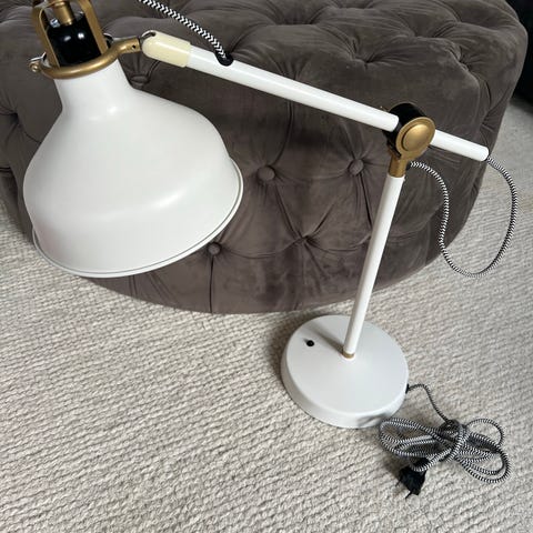 Gammel IKEA RANARP lampe i solid kvalitet. Bordlampen kan bruges som skrivebordlampe eller sengelampe, som det passer dig. Den kan nemt indstilles i højden. Pære medfølger desværre ikke, men kan købes i supermarkedet eller i IKEA.