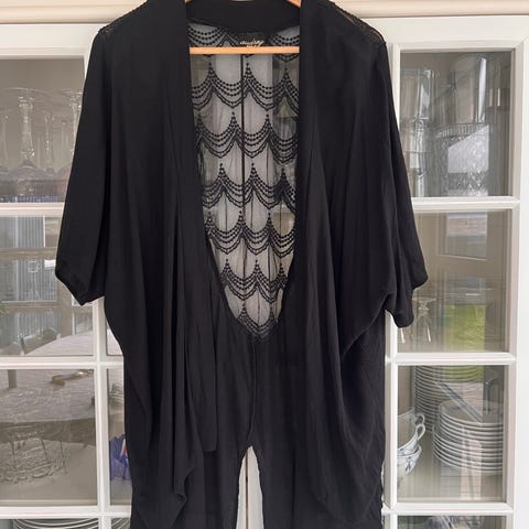 Andet, Lang cardigan i kimono facon, Prepair, str. One size, Sort med mønster, Viscose, Ubrugt, Lækker cardigan med flot mønster i kimonofacon fra Prepair. Har lommer og slids i siderne. Aldrig brugt.