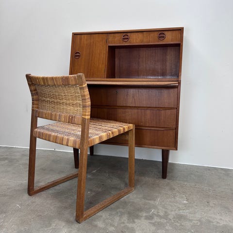 Dansk møbelarkitekt chatol med skrå front i fineret teak opsat på tilspidsede ben