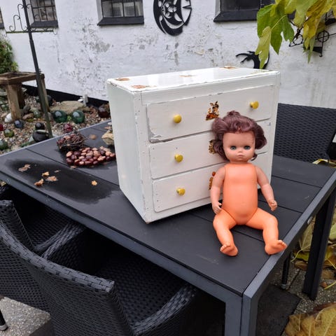 Dukkemøbler, dukke kommode, hvid malet dukke kommode med 3 skuffe h 38cm b 40cm d 20cm