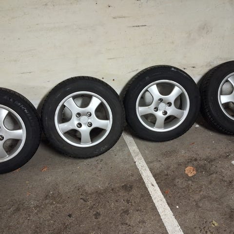 Alufælge med 2 Michelin dæk ( revner i dækkene som vist på billedet) og 2 Semperit dæk.
