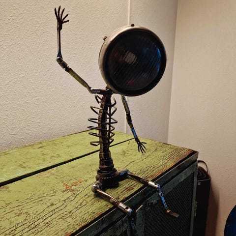 Sig hej til Kurt! Ikke bare en skulptur, men en ægte arbejdslampe med personlighed. Han er bygget som et skelet, hvor hans ben er solidt svejset fast, så han står stabilt og sikkert, uanset hvor du placerer ham.