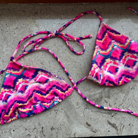 Den er sort med hvide blomster, materialet er 85 % nylon 15 % spandex,