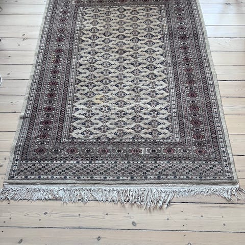 Et flot ægte tæppe der måler 1 m × 2,09 m uden frynser. Frynserne måler 15 cm i hver ende. Trænger til en rens, men er ellers flot velholdt.