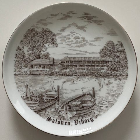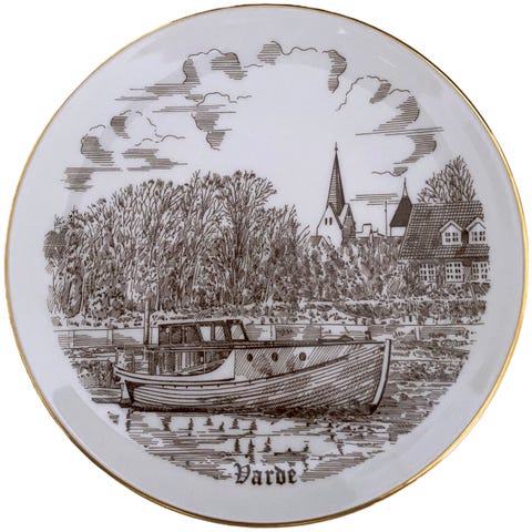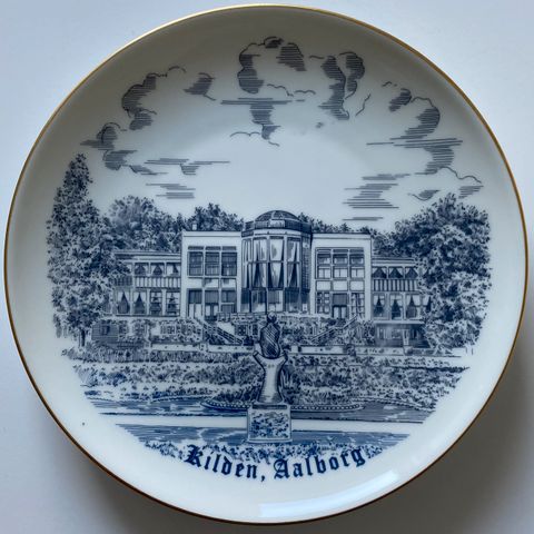 Flot hvid platte fra Bing & Grøndahl med åen, broen, hallen og restaurant Laksen i Holstebro som motiv.