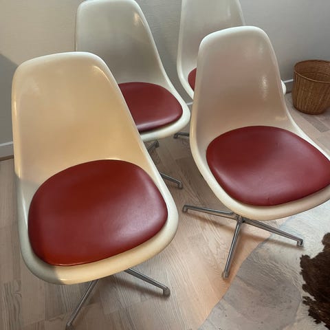 Sæt med 4 originale Charles Eames skalstole i cremefarvet glasfiber. Designet i 1948, fremstillet af Vitra med licens fra Herman Miller.