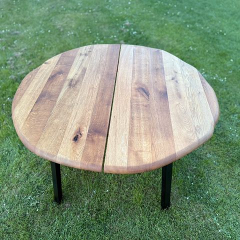 Plankebord i mørk gråolieret massiv egetræ og ben i sortmetal, som nemt kan skrues af for transport.