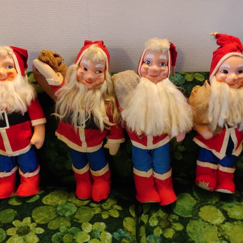 har her 4 nisser, som er håndlavet i helholdvis Sverige eller Danmark i midten af det 20. århundrede. nisserne er lavet af stof og i ansigtet en form for porcelæn.