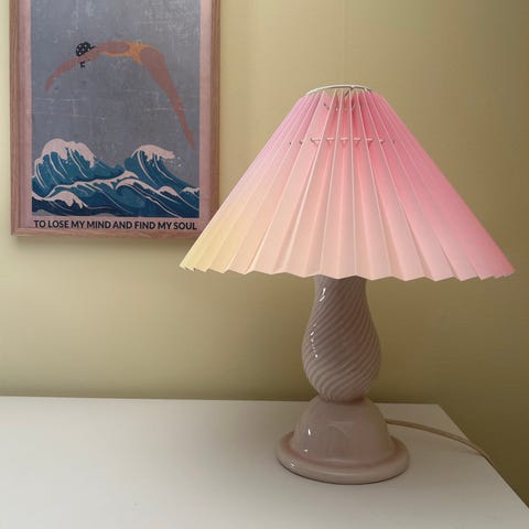 Den har en fin sart lyserød/beige lampeskærm på og sidder på en virkelig flot fod lavet af keramik og dertil en sort stofledning.