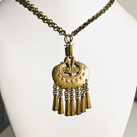 Stort håndlavet bronze vedhæng med kæde. Vintage 1965-70. Inspireret af keltiske smykkefund, år 800. Flot stand og kvalitet. Spiralerne symboliserer livets gang, de små bevægelige klokker jager onde ånder væk. Design fra finske juvelerfirma Kalevala Koru, grundlagt 1937. Måler 5,5cm x 4cm. Kæden er 68 cm. Stemplet made in Finland KK.