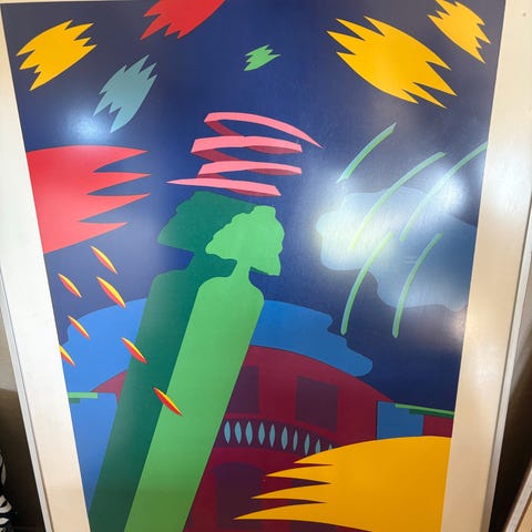 Tryk i glas og alu-ramme i klare flotte farver. Billedet viser en solnedgang. Teksten på billedet er: Når solen går ned i en sæk, står den op i en bæk. Mål 28x35