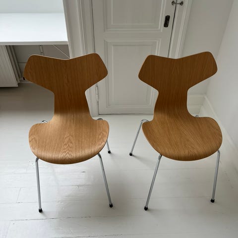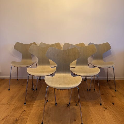Sæt med 6 gule Arne Jacobsen Grandprix stole med ben af massivt træ. Stolene er fra 2014 og fremstår i god stand dog med enkelte små mærker og ridser. •Designer: Arne Jacobsen •Producent: Fritz Hansen •Produktions år: 2014 •Model: Grandprix •Mål: Højde 83 / Bredde 50 / Dybde 51 / Sædehøjde 44,5 Cm •Materialer: ben træ •Stand: Brugte Arne Jacobsen Grandprix stole fra 2014