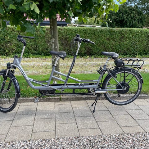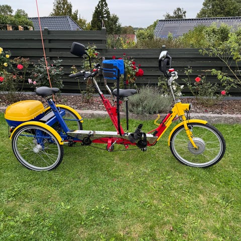 Barn/voksen tandem handicapcykel fra Huka - Co Pilot 3 med batteri. Den voksne cykler, men barnet foran kan til og fra kobles, så barnet enten cykler med, eller blot sidder foran uden at træde med. Cyklen kræver reparationer. Kæden på den forreste del af cyklen skal skiftes og repareres. Cyklen skal have nye bremseklodser, en ny pedal og nye dæk.