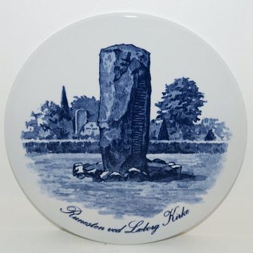 royal copenhagen, pynteplade, runesten, læborg kirke, danmarkshistorie, blå hvid porcelæn, dansk design, dansk kultur, kulturarv, vægplade, royal porcelain, vintage royal copenhagen, historisk motiv, samlerplade
