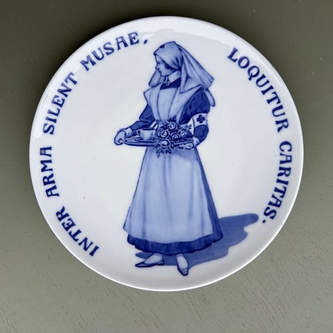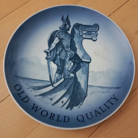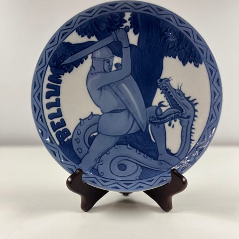 Pladen er i det klassiske blå-hvide porcelæn og er en del af en serie med danske kulturhistoriske motiver. Et elegant stykke dansk design og historie i ét.