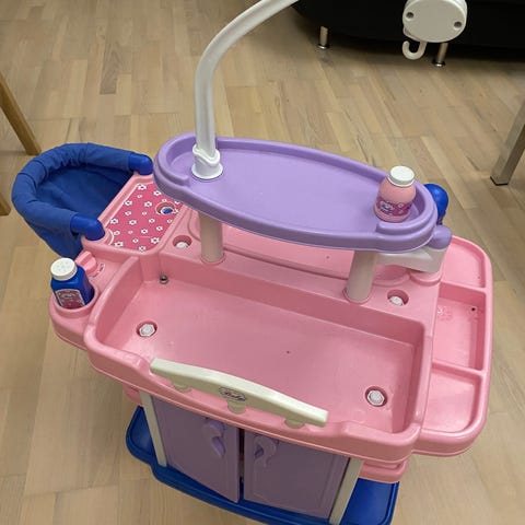 med indbygget badekar, skab med 5 bøjler, dukkestol, potte og en masse forskelligt badeudstyr.
