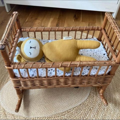 Skøn dukkevugge / dukkeseng i flet med stof i rigtig pæn stand.