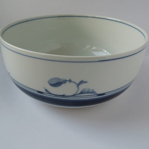 Skålen er lavet af glat hvidt porcelæn med en blå dekoration af vintergækker