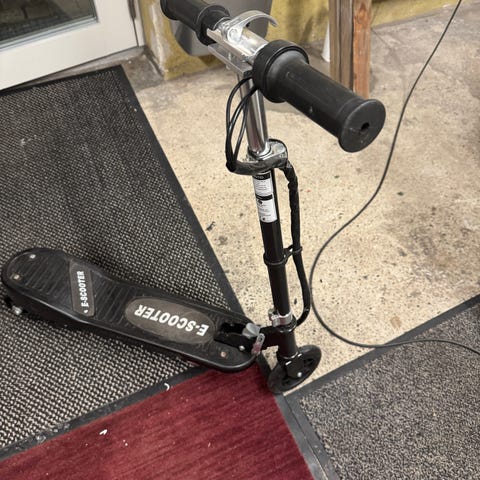 Elscooter til de mindste. Oplader er forsvundet og maskinen har stået i skuret et par år. Den kan spille nogle herlige melodier meget højt til glæde for barnet.
