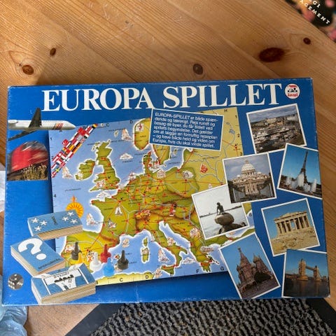 familiespil, spændende og lærerigt. Rejs rundt og besøg de byer, du får tildelt ved spillets begyndelse. Det gælder om at lægge en fornuftig rejseplan, og have både held og viden om Europa, hvis du skal vinde spillet. Stort kort på 52x 63 cm. 2-6 deltagere, fra 8-99 år, IKKE RYGER HJEM. FLOT STAND, kun æsken har lidt brugsspor. Sender gerne, dog ikke med fis færdig, porto oveni