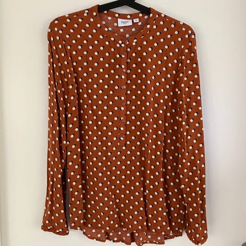 Saint Tropez Bluse i størrelse L med multifarvet design. Materialet er 100% bomuld. Blusen har lange ærmer og detaljer med knapper foran. Kan vaskes ved 40 grader, bør vaskes med lignende farver og uden blegemiddel. Prisen er vejledende - noget er er lidt dyrere, noget er billigere