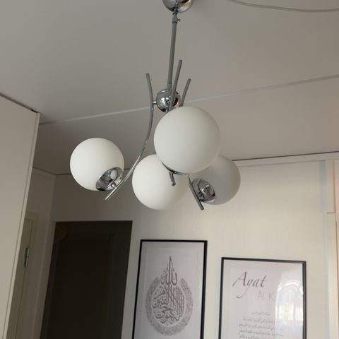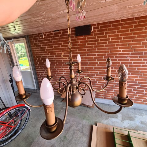 Fin lysekrone i hvidmalet jern. Der er trukket ledning, men jeg har ikke prøvet, om det virker, for jeg har aldrig fået monteret den.