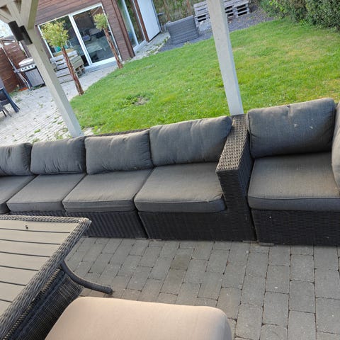 Sofa og stole er i sort jern med grå tilhørende hynder. Hynderne er med aftageligt betræk (lynlås). Bordet er i sort jern med en glasplade, som har et skår fra fabrikkens side (se billedet). Prisen er sat derefter, så bordet følger med gratis. Havemøbelsættet har stået i læ efterår og vinter.