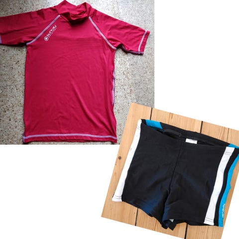 Til den ca. 14-16-årige dreng, da størrelserne er 176, XS og S i voksenstr. Af mærkerne Tecnopro og Primark. Velegnet til strand- og poolbrug. Fremstillet i hurtigtørrende materiale for komfort. Har ingen synlige brugsspor. Der gives mængderabat ved køb af mere tøj - bare spørg