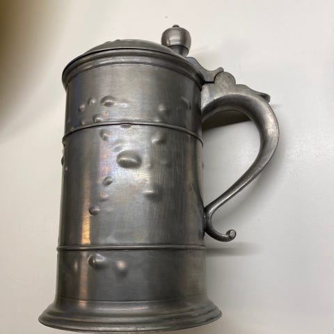 Ældre tinkrus med låg med Danmarks Lottekorps’ emblem på låget.