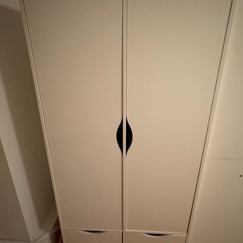 Rigtig fint klædeskab fra IKEA med en blå skuffe og bogreol / reol øverst til bøger, lampe eller andet.