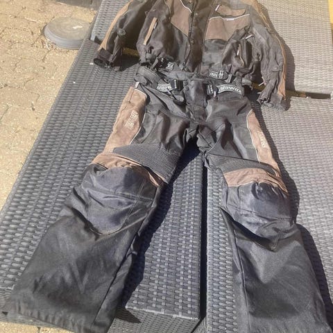 Dainese 2-delt køredragt i tekstil m. udtagelig inderfor. Dragten har lidt huller og "skrammer" på den højre side efter et styrt - se billeder.