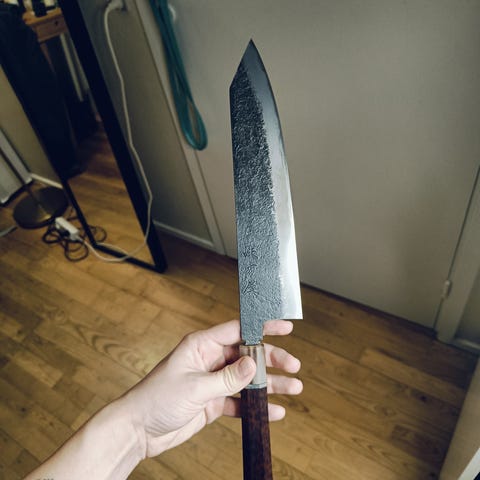 Kniven er smedet i Aogami (Blue) nummer 2 med kurouchi-finish og jerncladding. Kniven er smedet af Shogou Yamatsuka fra Baba Hamono i Sakai-regionen. Det er en kniv med en lidt tykkere profil og med wide bevel. Jeg har slebet den plan og den skærer supergodt med tyngde og autoritet. Den er nyslebet og poleret men patinerer hurtigt og flot med mange faver, når man bruger den.