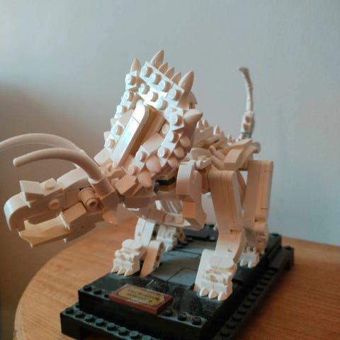 Dette er et lego t-rex skelet fra Lego sæt 21320 og det der vises i billederne er hvad der er. Du kan købe triceratops skelet og få begge for 275kr. sammen