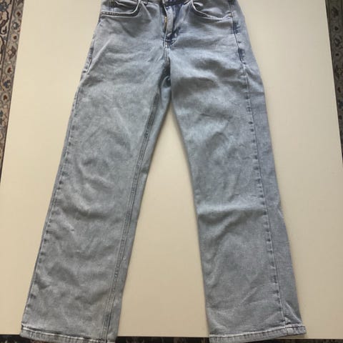 Til venstre: sorte jeans. Lukkes med lynlås og enkelt knap foroven. 2 for lommer og 2 baglommer. Stropper til bælte. Nypris 449,95 kr.