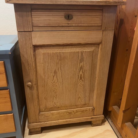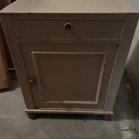 Grønt skab med to låger og dekorative detaljer. Skabet har en hylde, hvor bunden dog mangler (har engang været en marmorplade). Skabet er malet i en rustik stil og har en smuk patina.