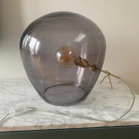 House Doctor bordlampe med en elegant kombination af glas og metal. Lampen har to kugleformede skærme, en i hvidt glas og en i røgfarvet glas, der giver et moderne og stilfuldt udtryk. Basen er lavet af metal med en messingfinish, der tilføjer et luksuriøst touch. Velegnet til brug som skrivebordslampe eller som dekorativ belysning i stuen.