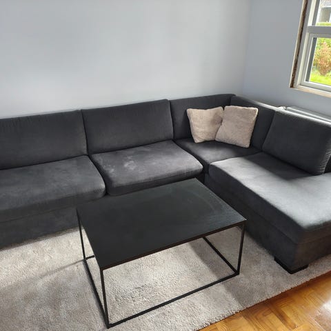Vi sælger en helt ny hjørnesofa med chaiselong, som er speciallavet. Sofaen består af to sammenkoblede dele, og chaiselongen måler 160 x 70 cm. Den samlede længde er 320 cm, og både dybden og højden er 75 cm.