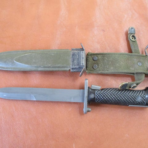 Bajonetten er Stemplet øverst på klingen U.C. U.O.C. 1942 samt serie nr. på håndtaget, skeden er stemplet med US Bombe.