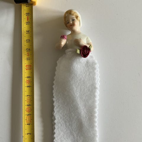 Mannequin med elegant helt hvid silkekjole, perle halskæde og paryk.