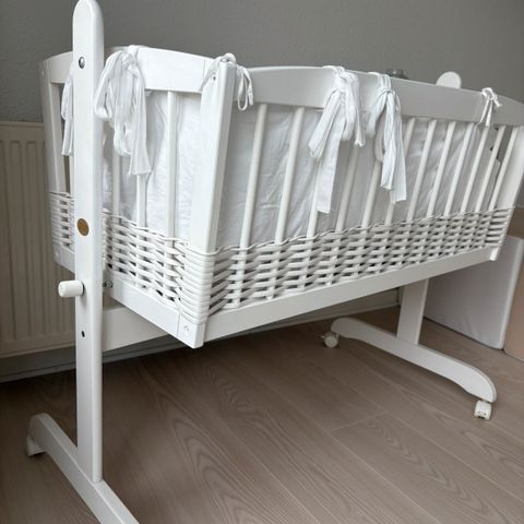 Vugge med tremmer som kan bygges om til junior seng i takt med at barnet vokser. Tysk produceret. Er afmonteret.