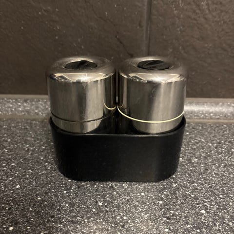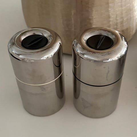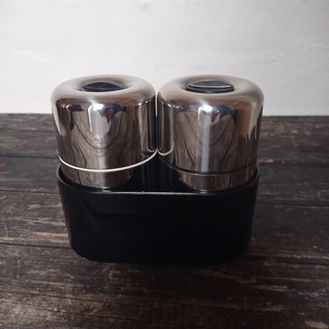 Et godt og flot stilfuldt kværnesæt i børstet rustfrit stål fra stelton, med sort bordholder. De er 10,5 cm høj og kværner godt. Sælges til fast pris + evt dao fragt.